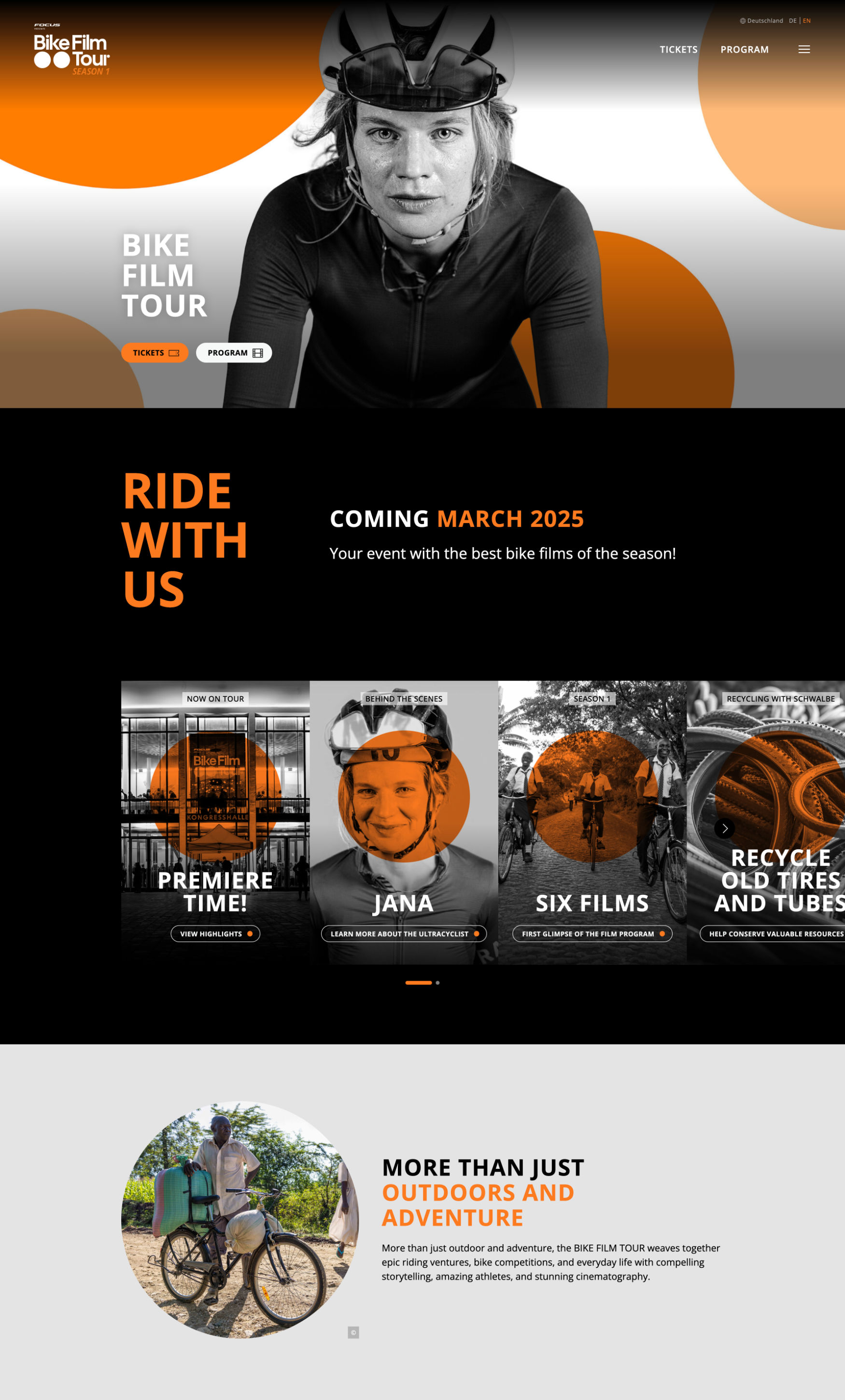 Mit Moving Adventures Medien, dem Veranstalter der Bike Film Tour, arbeiten wir schon seit über 17 Jahren zusammen. Neben der Bike Film Tour veranstalten sie auch die European Outdoor Film Tour und die Ocean Film Tour. Alle drei Webseiten teilen sich das technische Framework, so dass neue Elemente nicht nur für eine Seite, sondern für alle drei sofort verfügbar sind. Nice!
