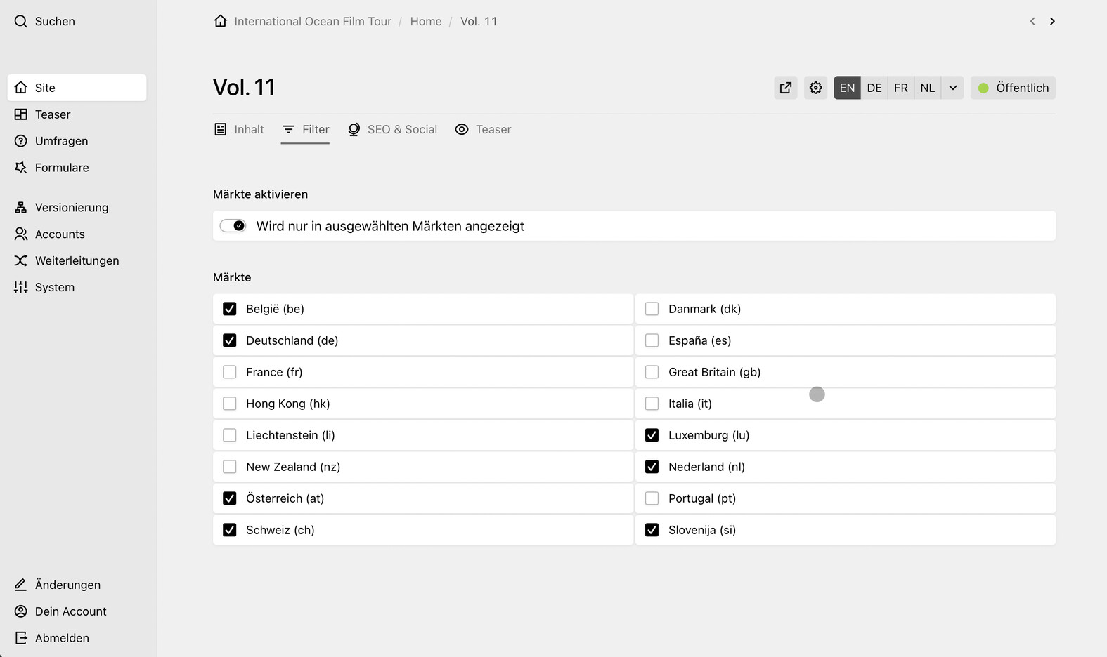 Marktauswahl für Einzelseiten im Admin-Panel