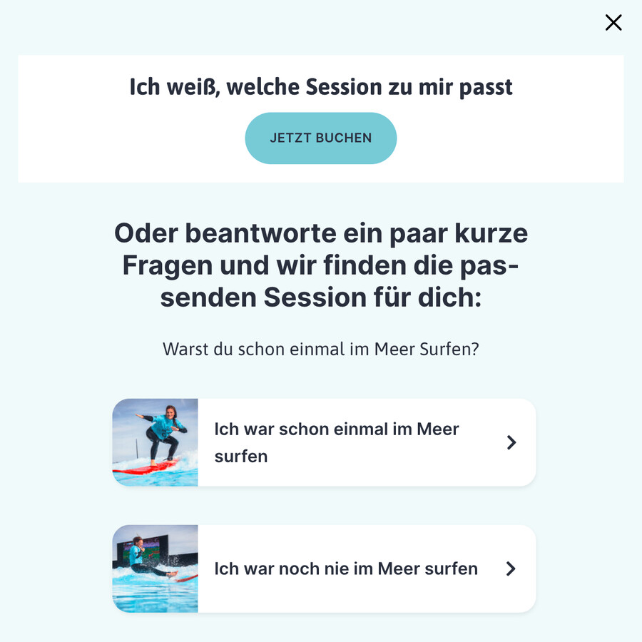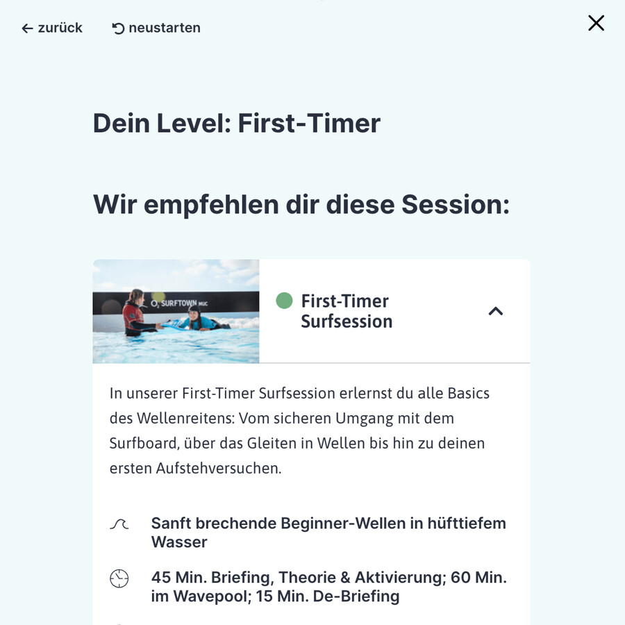 Der Surf Level Finder steht zentral im Buchungsprozess zur Hilfe, aber drängt sich nicht auf.